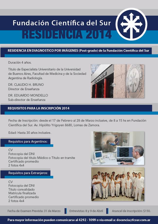 RESIDENCIAS MÉDICAS 2014 RESIDENCIA EN DIAGNÓSTICO POR IMÁGENES Título de especialista universitario en diagnóstico por imágenes SAR Duración 4 años.