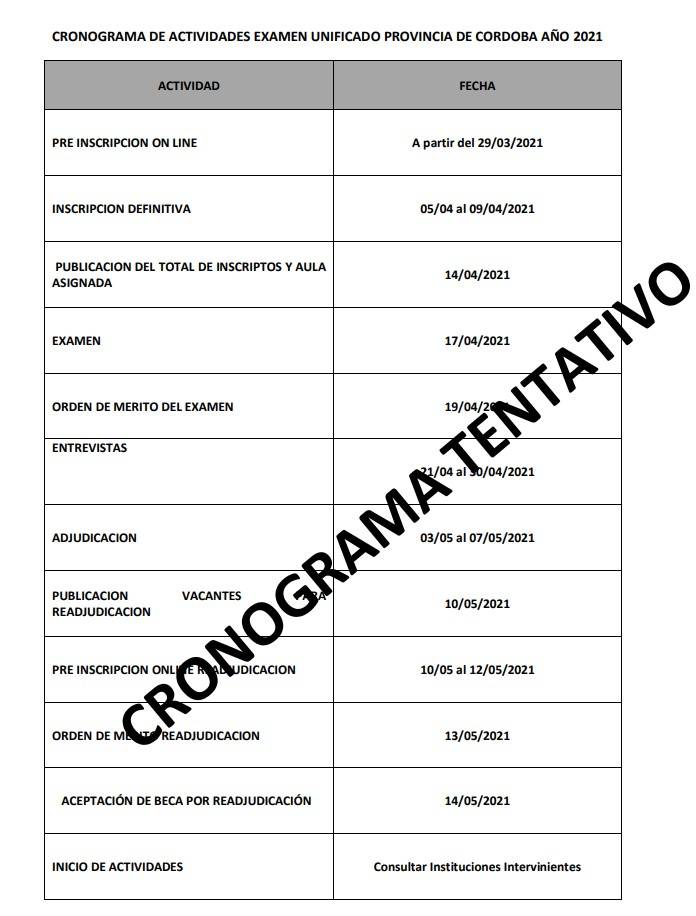 Se dieron a conocer las fechas tentativas del examen unificado de Córdoba 2021.