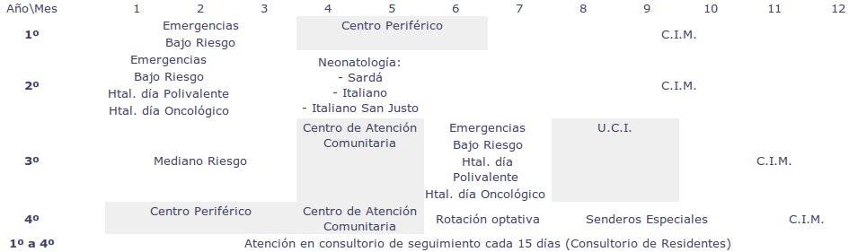 Para el correcto logro de los objetivos educacionales, el Programa de la Residencia cuya duración es de cuatro años, contempla desarrollar tareas asistenciales bajo la supervisión permanente del personal de planta, con grados crecientes de responsabilidad por parte del Residente. Durante ese lapso, los Residentes podrán adquirir nuevos conocimientos y desarrollar independencia mientras se adquiere una mayor experiencia en el cuidado de la salud y en el manejo de aquellas situaciones que luego deberán enfrentar en la práctica profesional.